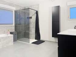 Hall d'accueil carrelé Trois chambres carrelées Un bureau Grande salle de bain avec douche, baignoire, WC suspendu, meuble double vasque suspendue et nombreux rangements