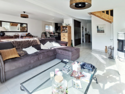Séjour double carrelé avec poêle à granulés et 2 grandes baies vitrées donnant sur le jardin SUD, cuisine américaine aménagée, cellier, 5 chambres parquetées (dont 1 suite parentale et une grande chambre sous combles), salle de bains et salle d'eau. 2 parkings extérieurs complètent le tout.