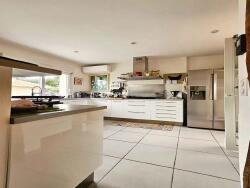 L'étage abrite un espace de vie lumineux avec cuisine équipée ouverte sur la salle à manger et le salon, bénéficiant d'un plafond "cathédrale" en bois et d'un accès direct à une terrasse panoramique d'environ 40 m², dont 14 m² couverts.