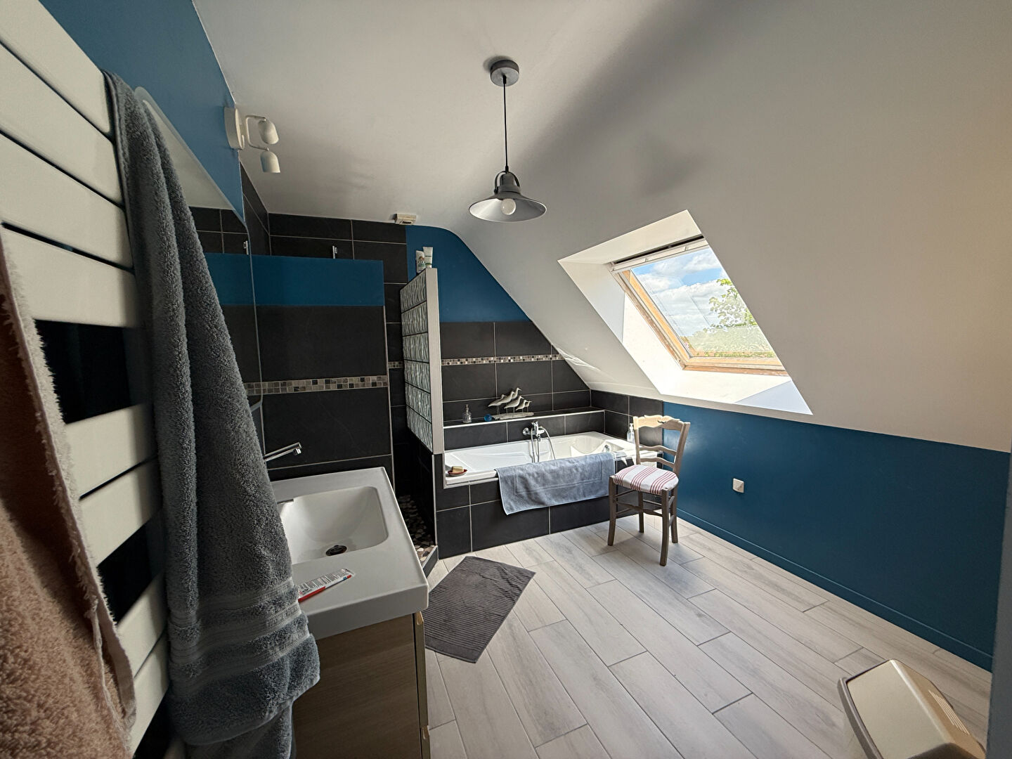 Au rdc : une entrée avec placard, wc indépendant, un couloir, une grande pièce de vie de 40 m2 avec poêle hybride et accès balcon via la porte fenêtre, cuisine aménagée et équipée ouverte de qualité. Deux chambres de grandes tailles, une salle de bain avec baignoire et douche à l'italienne.