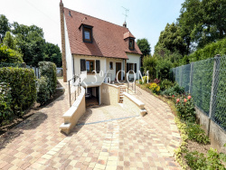 3% POISSY IMMO vous présente : Secteur très recherché de Verneuil (78) A 5 min de la gare et des écoles( proche Notre Dame) ; Maison d'architecte en parfait état d'environ 147m2 habitable, édifiée sur un terrain paysagé arboré d'une superficie de 928m2 -Au rez de chaussée : Une entrée, un séjour avec sa cheminée à insert, une cuisine entièrement équipée, un bureau/chambre, une penderie 3 portes et un WC. -A l'étage : Un dégagement, 2 belles chambres avec placard de rangement, un WC séparé, UNE SUITE PARENTALE AVEC BAIGNOIRE D'ANGLE, une salle d'eau -Au sous-sol TOTAL carrelé : Une buanderie avec évier, une FAMILY ROOM 25m env, une cave à vins gravillonnée et un garage, un dégagement de 8m2 stockage vélo/moto/garde manger