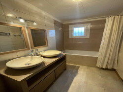 Le rez-de-chaussée accueille une cuisine équipée, propice à la préparation de repas conviviaux. Le salon lumineux, grâce à ses ouvertures modernes, s'ouvre sur le jardin offrant une belle vue sur l'extérieur. La salle de bains est équipée de doubles vasques, apportant une touche de modernité et de praticité.
