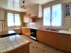 Cette maison de 110 m2, élevée sur sous-sol, comprend : - En rez-de-chaussée : cuisine aménagée, séjour, deux chambres dont une avec placard, salle d'eau, WC. - Au niveau sous-sol : entrée, chambre avec lavabo et WC, espace dressing, chaufferie, garage. - Cour et jardin.