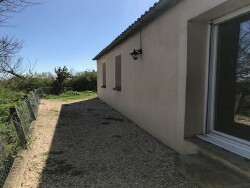 Maison de plain pied de type 4 mitoyenne par le garage comprenant une entrée avec placard, un espace cuisine ouvert sur le séjour, 3 chambres, une salle de bains, un WC, un garage, et un jardinet non clos de 200 m2 environ.
