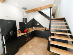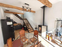 EN EXCLUSIVITE - dans le centre d'AUBIET - Maison de rue T4 de 100 m2 entièrement rénovée avec goût, alliant ancien et moderne. Au rez-de-chaussée : grande cuisine équipée de 22 m2 avec poêle à granulés, salle de bains en travertin (douche, WC, buanderie) et chambre cosy avec accès indépendant. À l'étage : salon lumineux avec belle hauteur sous plafond et poutres apparentes, 2 chambres dont une avec dressing + WC. Prestations de qualité : double vitrage, électricité neuve, toiture refaite, façade neuve, tout-à-l'égout. Travaux sous garantie décennale. Excellent DPE A maison très économe.