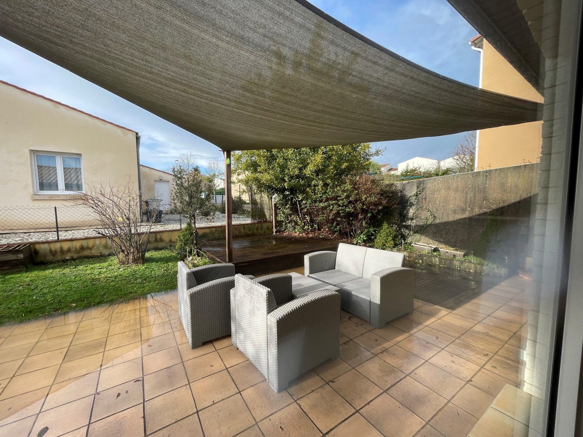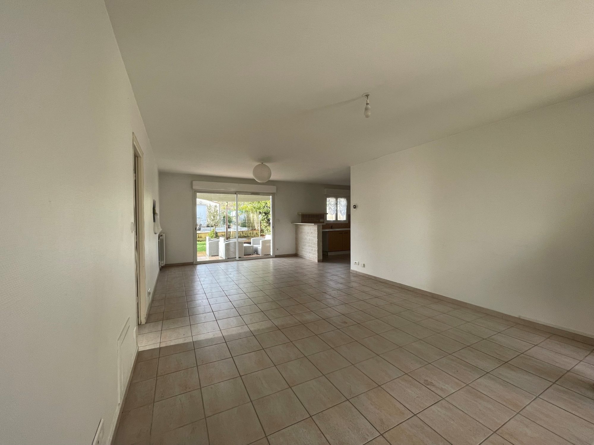 Maison de type 5 de plain pied comprenant : un séjour avec une cuisine ouverte aménagée et équipée (four, plaque électrique et hotte), un dégagement, 4 chambres avec placards, un WC , une salle d'eau. Un garage. Une terrasse de 48m2 et un jardin. Libre de suite.