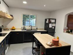 Une cuisine attenante, mise en valeur par une voûte pleine de cachet, offre un bel espace repas avec poutre apparente et rangements généreux.