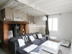 La maison s'ouvre sur une grande cuisine aménagée et équipée, dans son prolongement un salon cosy avec sa belle cheminée et son insert. De l'autre coté, nous trouvons un espace pouvant servir de salle à manger avec baie vitrée s'ouvrant sur un joli patio / terrasse de 10 m². Toujours en rez de chaussée , une buanderie et un WC séparé.