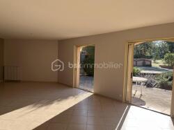 Maison traditionnelle sur un terrain arboré avec une belle terrasse, une piscine et un jardin. Elle se compose d'un salon séjour avec cheminée, et baie à galandage sur la terrasse.