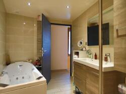 Salle de bain luxueuse avec douche à l'italienne, double vasque et baignoire balnéo.
