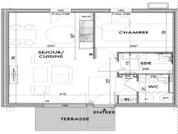 Cette Maison T2 est livrée équipée (sauf cuisine en option) : peintures, salle de bains, sols. Elle comprend : - Séjour traversant 33,35m2, terrasse 7m2, entrée avec placard -Une chambre 11,8m2 - Salle d'eau douche à l'italienne meuble vasque sèche serviette, wc séparé, coin buanderie Parking