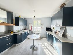 Entrez dans une **cuisine aménagée et équipée**, où chaque élément a été pensé pour allier fonctionnalité et esthétique. Les plans de travail en granit, les électroménagers haut de gamme et les rangements astucieux en font un espace où il fait bon préparer des repas gourmands tout en profitant de la vue sur le jardin. Le **double vitrage** des portes et fenêtres enveloppe la maison d'une douce chaleur, tout en assurant une isolation phonique et thermique optimale.