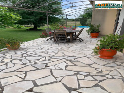 En campagne, une villa de plain-pied de 120m² sur environ 1200 m² de terrain comprenant : une cuisine semi-équipée ouverte sur une grand séjour, trois chambres, une salle de bain avec douche et baignoire, un WC séparé, une terrasse, une buanderie, un garage attenant de 16.73m² avec une partie stockage, un double garage de 22.38m², deux cabanons et un jardin avec une piscine hors-sol.