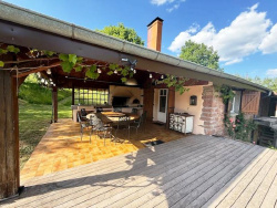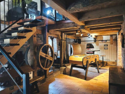 Rez de Jardin : - très grande pièce de vie avec cheminée , et machinerie du moulin apparente ce beau volume comporte une cuisine à l'Américaine super équipée , et un accès direct vers une belle terrasse couverte avec cuisine d'été et vue sur la nature , ce niveau comporte également 2 belles chambres , 1 salle de bain avec baignoire et vasque , et wc .