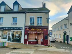 Immeuble avec local commercial, cuisine, séjour, wc, arrière-cuisine, chambres froides, garage ; étage : palier, wc, salle d'eau, 3 chambres ; grenier aménageable ; cave ; idéal pour un projet professionnel, grand espace de stockage