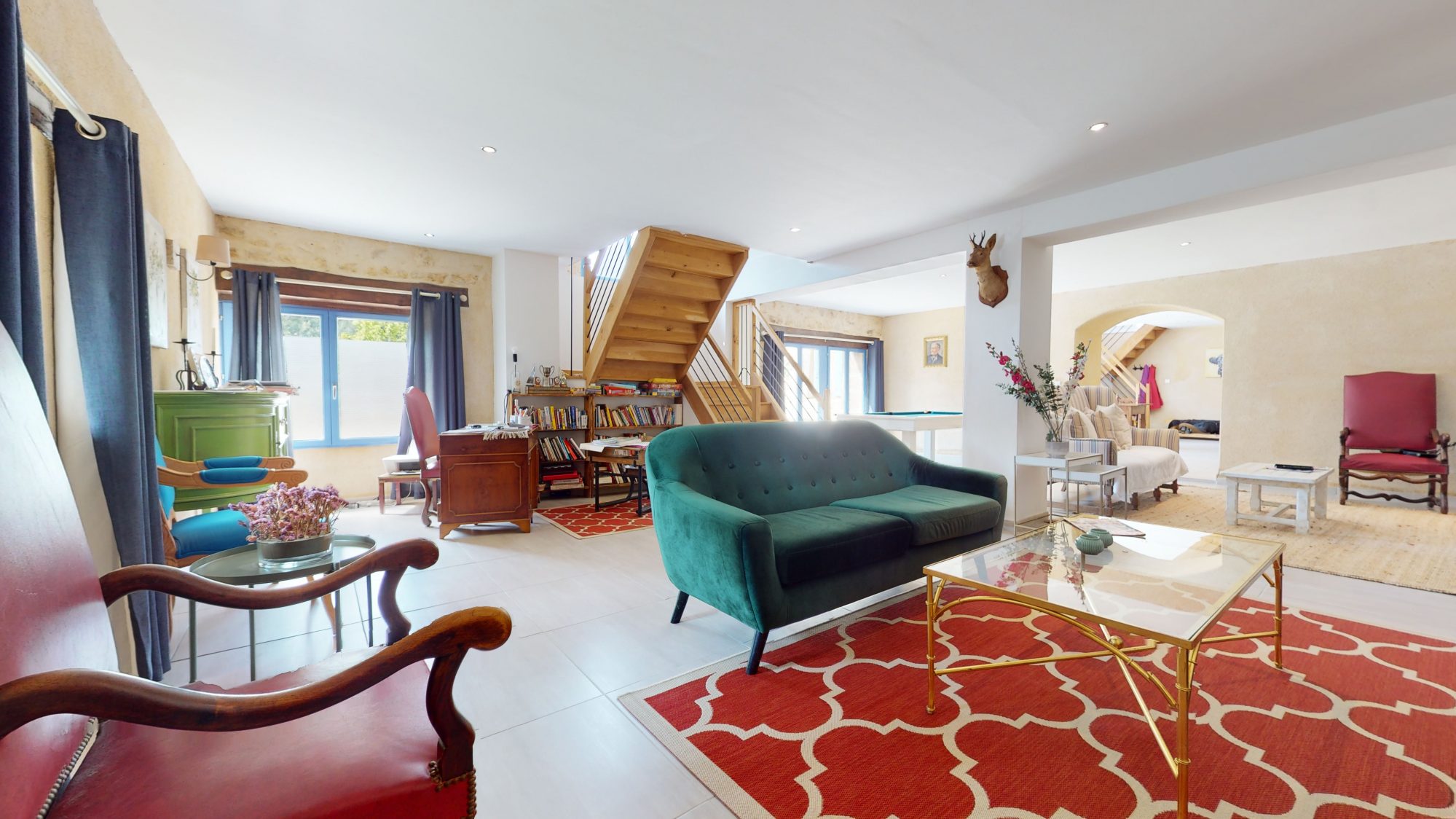 Au rez-de-chaussée, une majestueuse entrée distribue sur la droite un grand séjour, une pièce à rénover ; sur la gauche, une salle à manger, un second séjour, une cuisine ainsi que trois pièces à aménager selon vos besoins. Au fond du couloir, un cabinet de toilette. Un escalier ancien d'une grande élégance mène aux étages.