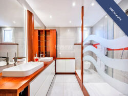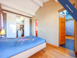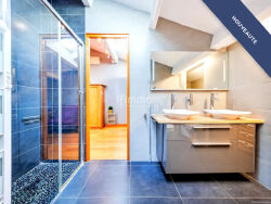 L'étage encore supérieur est entièrement dédié à suite parentale. Cet espace occupe tout le plateau et offre de beaux volumes. Il comprend un bureau particulièrement spacieux (qui pourrait facilement être transformé en chambre supplémentaire, en salle de jeux/cinéma, ...), ainsi qu'une salle de bain, des toilettes et un véritable dressing. La suite s'ouvre sur une terrasse offrant une vue dégagée. Les prestations sont soignées et de qualité. La climatisation réversible équipe l'ensemble de la maison et assure un confort optimal toute l'année.