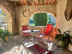 Un large escalier en pierre conduit à une terrasse ombragée exposée sud, ouvrant sur l'habitation principale :