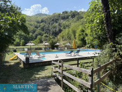 Située au sein d'un hameau paisible, cette propriété unique offre un accès privé à une rivière, entourée de forêts et de champs, alliant tranquillité et proximité des grands axes routiers. À seulement 20 minutes de l'Espagne, 50 minutes de Perpignan et de la mer, cette vaste demeure conjugue confort et authenticité. Cette propriété d'environ 770 m2 habitables se compose d'un grand mas en pierres rénové d'environ 569m2 habitable, réparti en 6 gîtes exploités en chambres d'hôtes 3 étoiles, une salle de réception, ainsi que 3 bâtiments principaux et 4 dépendances, le tout sur environ 7 hectares de prairies et forêts. L'habitation principale, construite en 2010, de plain-pied, de type T4 d'environ 129m2, comprend un salon, une cuisine équipée, trois chambres (dont une avec salle d'eau attenante), salle de bains, deux WC, une cave et bénéficie d'une climatisation gainable. Un autre bâtiment, datant de 2013, abrite une salle de réception avec cuisine et WC, avec un appartement en cours de finition à l'étage. À l'extérieur, profitez d'une magnifique piscine de 20x5 mètres avec sa terrasse, d'une chapelle, d'un terrain de jeux, d'installations pour enfants et de petites plages au bord de la rivière, un atelier, une grange, une écurie et un espace de stockage. Terrain 6,5 hectares.