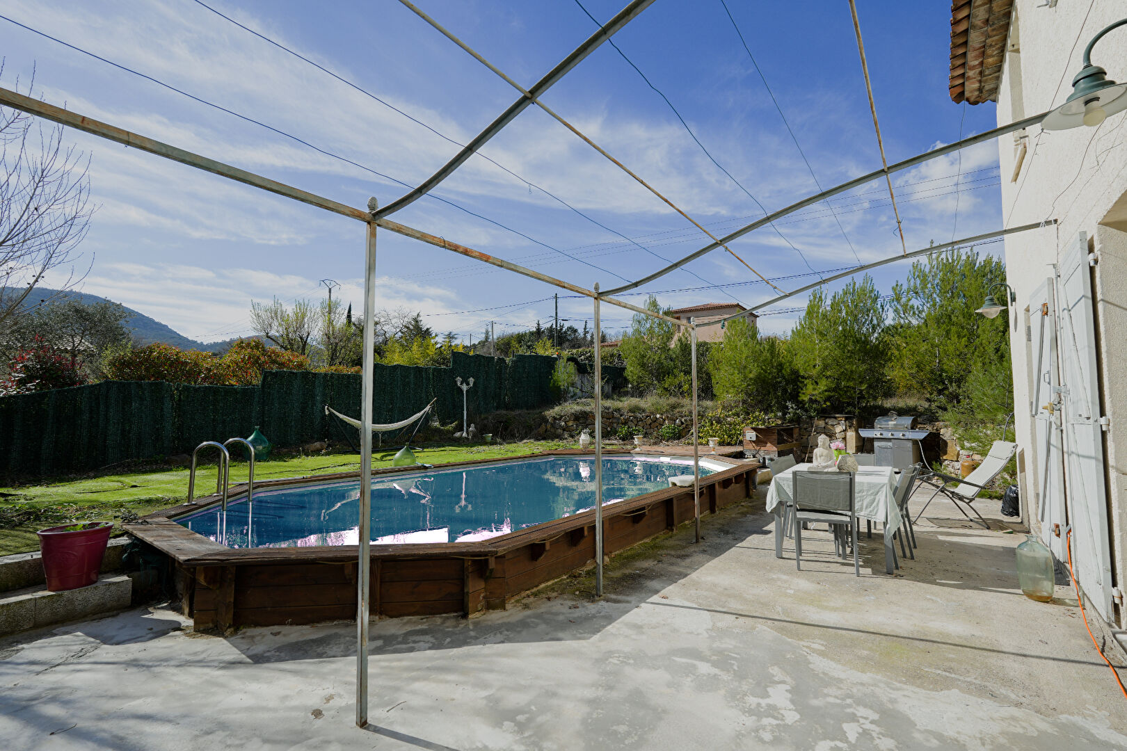 À l'extérieur, le terrain de 2174 m² accueille une piscine de 9 par 4, idéale pour les journées ensoleillées, ainsi qu'une grande terrasse de plus de 30 m² exposée plein sud, ombragée par 2 platanes centeniares, pour profiter pleinement de l'environnement paisible.