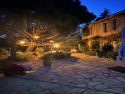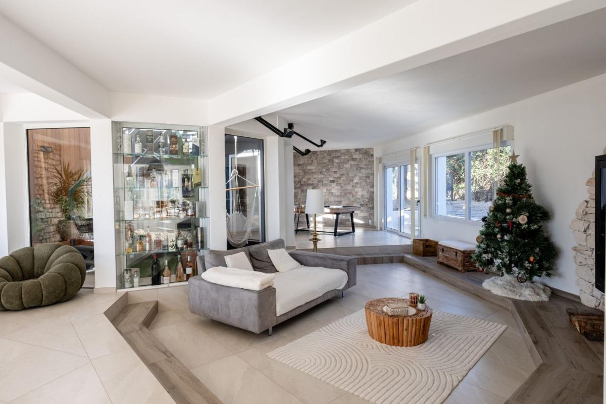 Le Mas principal de 190 m² environ offre un vaste espace de vie au rez-de-chaussée : une cuisine ouverte sur le séjour lumineux de 73 m² avec cheminée, une arrière-cuisine, ainsi qu'une chambre et un WC indépendant.