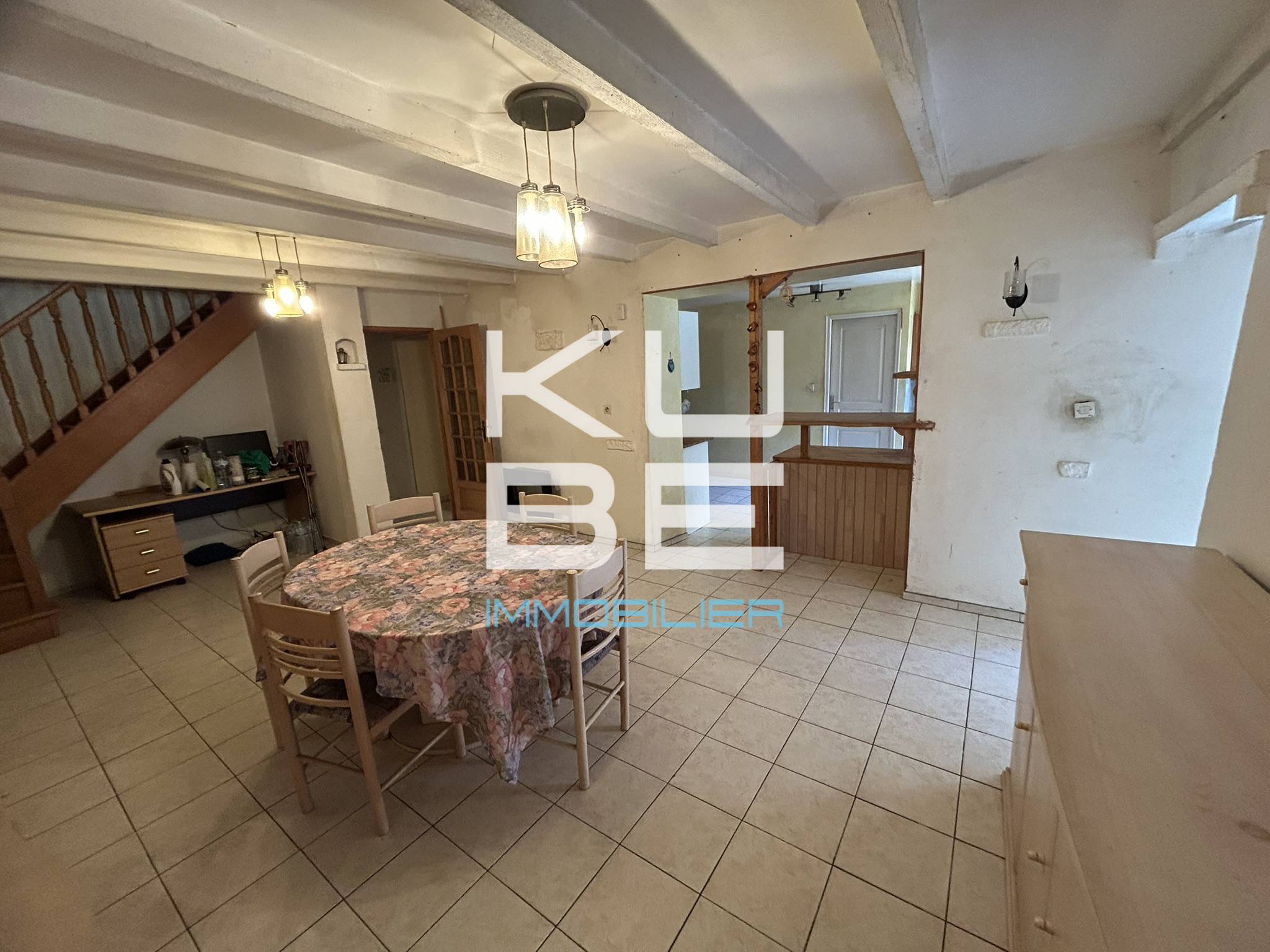 Cette maison de village mitoyenne des deux côtés, un côté est mitoyen à une annexe, est composée au rez-de-chaussée, d'un espace de vie avec un poêle à pellet ouvert sur une cuisine équipée, d'une salle de bains et d'un WC indépendant.