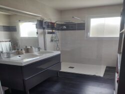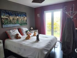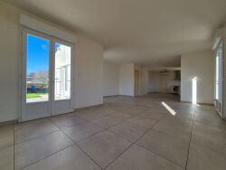 A proximité de tous services, commerces et écoles (1,8 km du centre-ville), très belle maison contemporaine (2015) RT2012 de plain-pied implantée dans un quartier calme et résidentiel, très lumineuse, offrant une surface habitable de 93 m² environ : vaste pièce à vivre traversante de 44 m² avec cuisine équipée ouverte sur salon-salle à manger avec baie vitrée ouvrant sur terrasse, 3 grandes chambres avec placards, salle d'eau, wc. Pompe à chaleur. Chauffe-eau thermodynamique. Garage à vélos. Grand vide sanitaire. Terrasse et balcon offrant une superbe vue dégagée sur la campagne. Terrain de 1049 m².
