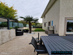 La cuisine aménagée et équipée et ouverte sur le salon séjour de 45 m2 est un véritable espace de vie où vous pourrez préparer vos repas tout en profitant de la compagnie de vos proches. Cette pièce de vie est baignée de lumière grâce à ses ouvertures en double vitrage, offrant une vue dégagée sur le jardin, la piscine et les terrasses et le terrain de pétanque Avec ses 4 chambres dont 1 suite parentale, cette maison est parfaite pour les familles ou ceux qui aiment recevoir. Cette maison de standing, avec son intérieur et sa toiture en excellent état, est chauffée individuellement par une pompe a chaleur avec climatisation et dispose de 2 WC ainsi qu''une salle d'eau et une salle de bains.