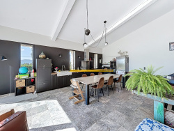 Une pièce de vie majestueuse de plus de 50 m2, baignée de lumière, avec charpente apparente et larges ouvertures sur l'extérieur
