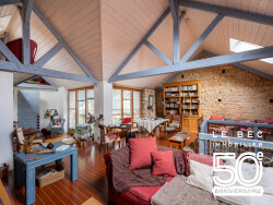 À l'étage, vous serez charmé par la belle hauteur sous plafond et les poutres apparentes qui confèrent un cachet unique à l'ensemble. Une mezzanine spacieuse et baignée de lumière offre de multiples possibilités d'aménagement, avec la possibilité d'y créer deux chambres supplémentaires. Vous y trouverez également une salle de bains ainsi qu'une chambre , et des combles aménagées.