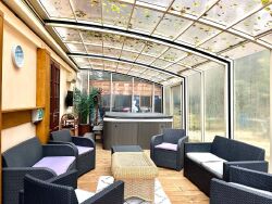 Une magnifique véranda de 31 m², entièrement amovible et ouvrable pour profiter des beaux jours, abrite un espace bien-être avec spa et sauna 5 places. Juste à côté, un terrain de jeux ravira toute la famille avec terrain de pétanque, panier de basket et table de ping-pong.