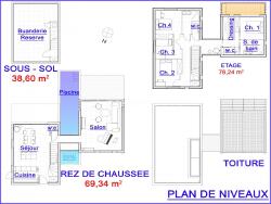 Surface habitable totale : 186 m², répartis comme suit : 38 m² au niveau -1, -70 m² au rez-de-chaussée et 78 m² à l'étage.