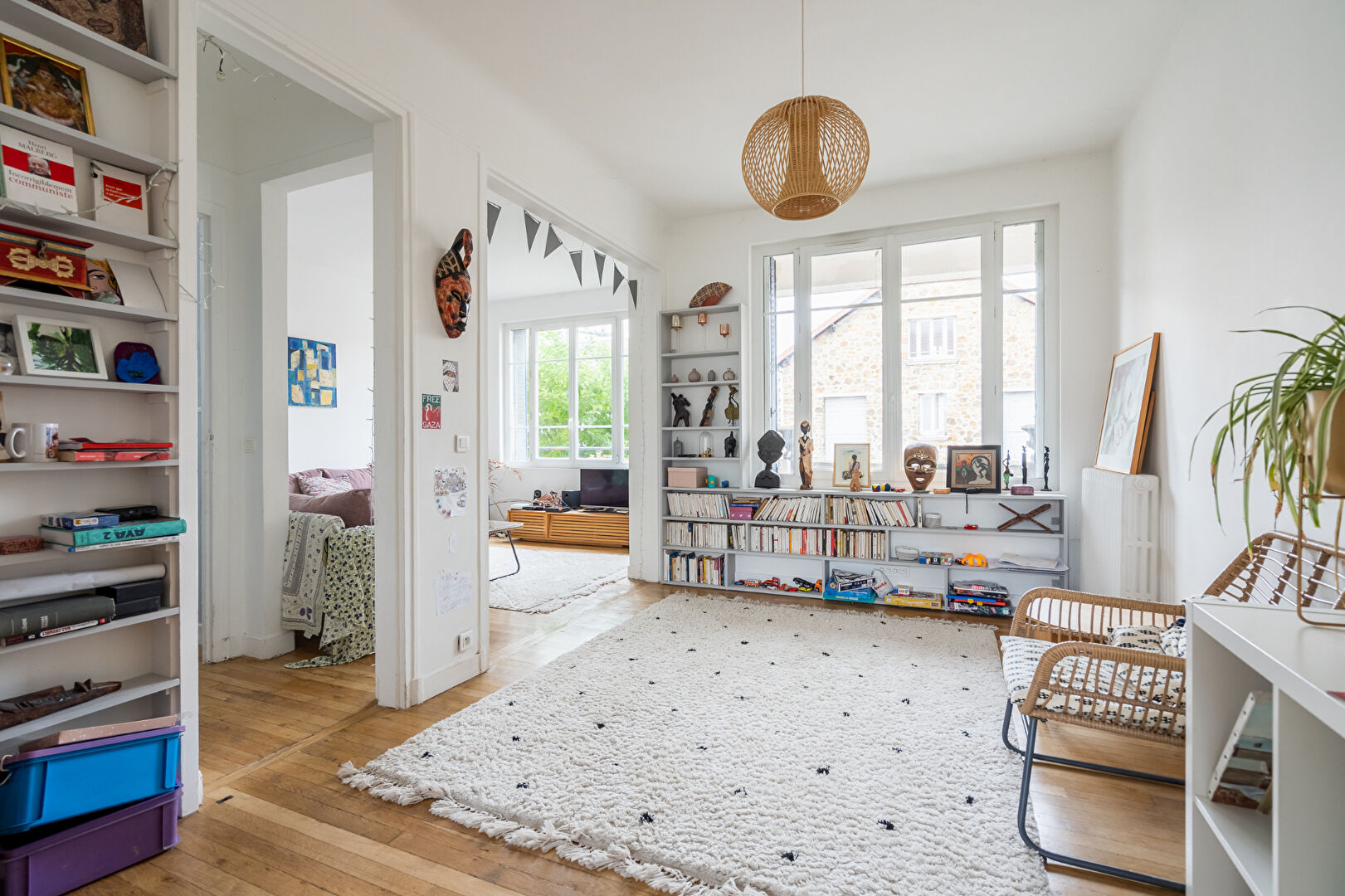 A MONTREUIL, quartier Solidarité-Carnot, à 900 mètres du métro Croix de Chavaux (ligne 9), à 5 minutes à pied de la place Carnot avec son marché de producteurs, proche du parc des Beaumonts, à deux pas de l'école élémentaire Jeanne d'Arc et aux portes de la ville de VINCENNES. Nous vous proposons une maison en parfait état général de 6 pièces de 177,75 m² habitable. Elle se compose, d'une entrée, deux salles de bains, une salle d'eau, deux grands espaces de vie avec cuisine, trois chambres avec rangements, trois wc ainsi, une buanderie et d'une belle pièce au sous-sol. Une cour de 48 m² pouvant redevenir un jardin complète ce bien. Exposée Sud, Est et Ouest, cette maison dans un quartier très recherché bénéficie aussi d'être au calme.