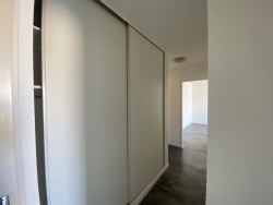 Le logement offre une entrée avec placard, une cuisine toute équipée (plaque, hotte, four-frigo-rgmt), un grand séjour avec parquet flottant, 2 chambres dont une avec placard et une salle de bain.