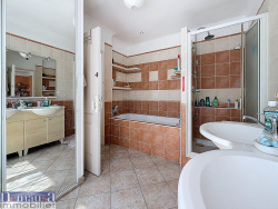 À l'étage, un dégagement dessert quatre chambres avec placards, dont une suite parentale avec accès balcon et salle de bains privative (baignoire, douche, double vasque). Une seconde salle d'eau ainsi qu'un WC indépendant viennent compléter cet étage.