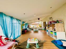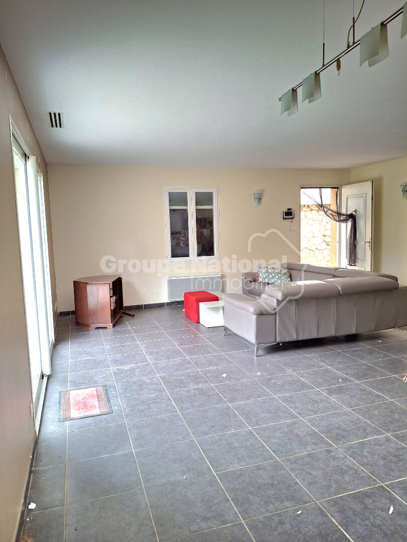 À l'intérieur, la maison de 125 m² propose en RDC une agréable pièce de vie avec cheminée, une cuisine récente ouverte aménagée et équipée, une véranda servant actuellement d'espace enfant, un WC.
