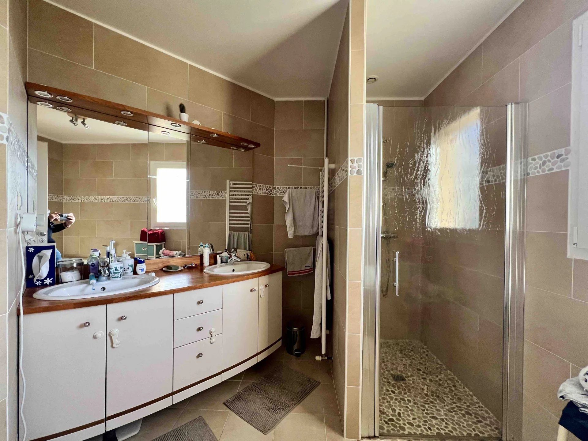 A l'étage on retrouve un hall desservant 3 chambres avec rangements, un espace bureau et une salle de bain avec baignoire et WC intégrés.