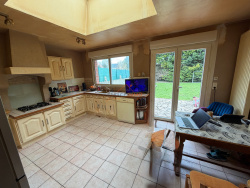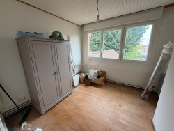 Située en retrait de rue, dans un environnement calme, cette longère semi-individuelle offre un beau potentiel et de beaux volumes. Au rez-de-chaussée, vous découvrirez un hall d'entrée desservant un grand séjour lumineux, une chambre pouvant également faire office de bureau, une cuisine meublée, ainsi qu'une salle de bains à terminer et des toilettes séparées. À l'étage, un couloir distribue trois chambres, un bureau ou cellier ainsi qu'une salle d'eau. La maison dispose également d'un double garage, d'un espace de stationnement et d'un jardin agréable avec chalet de jardin, idéal pour profiter des beaux jours. Des travaux de rafraîchissement sont à prévoir, offrant la possibilité de personnaliser ce bien selon vos envies. Le chauffage est assuré par une installation centrale au gaz. Une belle opportunité à saisir ! Classe énergie E