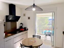 Un séjour de 21m² avec cuisine ouverte entièrement équipée et lit 2 personnes escamotable Le séjour ouvre sur une grande terrasse carrelée et abritée
