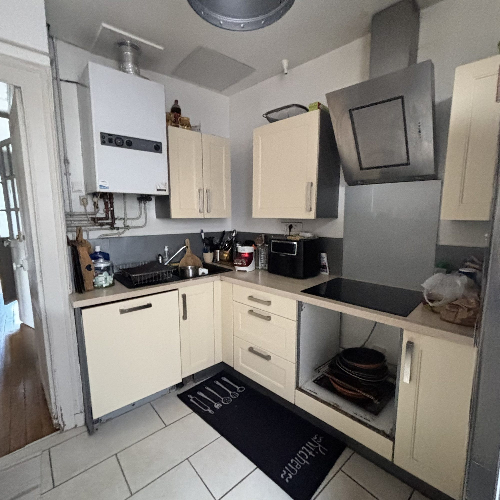 Cuisine ouverte sur un salon/séjour chaleureux avec cheminée à insert