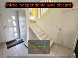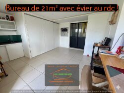 Elle dispose au rdc : D'un grand hall d'entrée indépendant avec placard, d'une chambre ou d'un bureau (21.7m²) carrelé avec évier et accès indépendant (idéal profession libérale ou télétravail ou encore studio locatif ), un wc indépendant avec lave-mains et un grand garage de 45m² avec porte électrique sectionnelle.