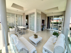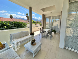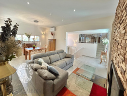 Spacieux salon-séjour, baigné de lumière grâce à de larges baies vitrées, avec cheminée, climatisation réversible et accès direct à la terrasse couverte d'environ 50 m2, exposée Est/Sud.
