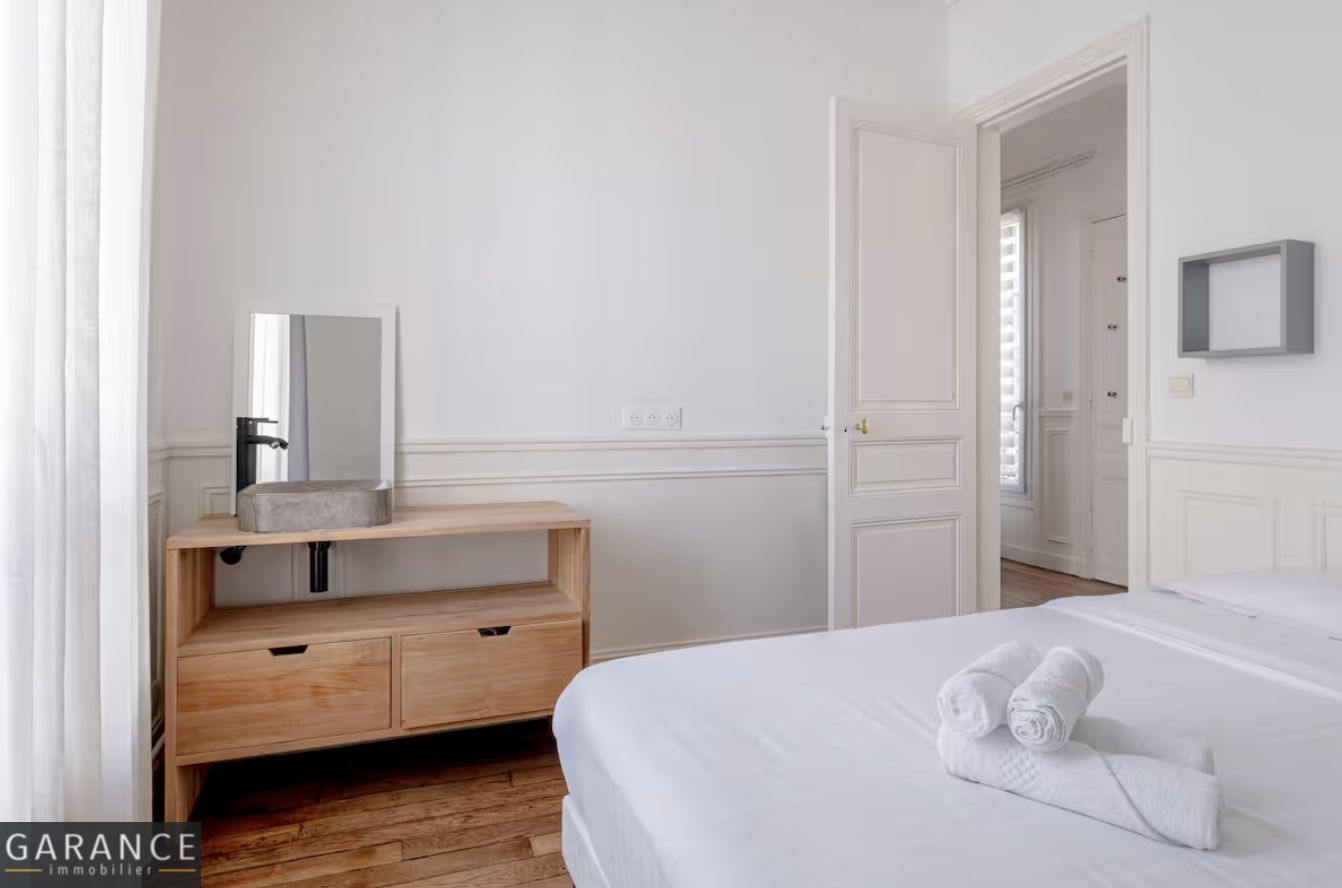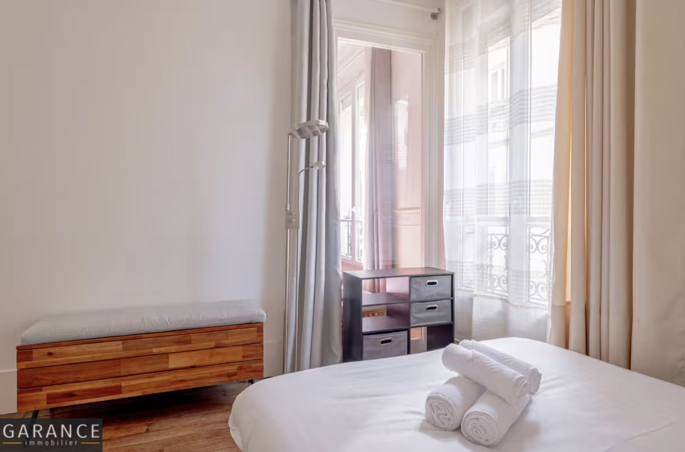 L'appartement se compose d'une entrée menant à un grand séjour doté de deux baies vitrées ouvrant sur une terrasse de 8 m² donnant sur une cour arborée. Cet espace de vie intègre une cuisine américaine aménagée et entièrement équipée, ainsi qu'un coin dinatoire et un espace bibliothèque/bureau. La chambre, orientée sur une seconde terrasse de 8 m² donnant sur une petite cour fermée, bénéficie d'un dressing intégré et d'une salle de bains semi-ouverte. Les WC sont indépendants.