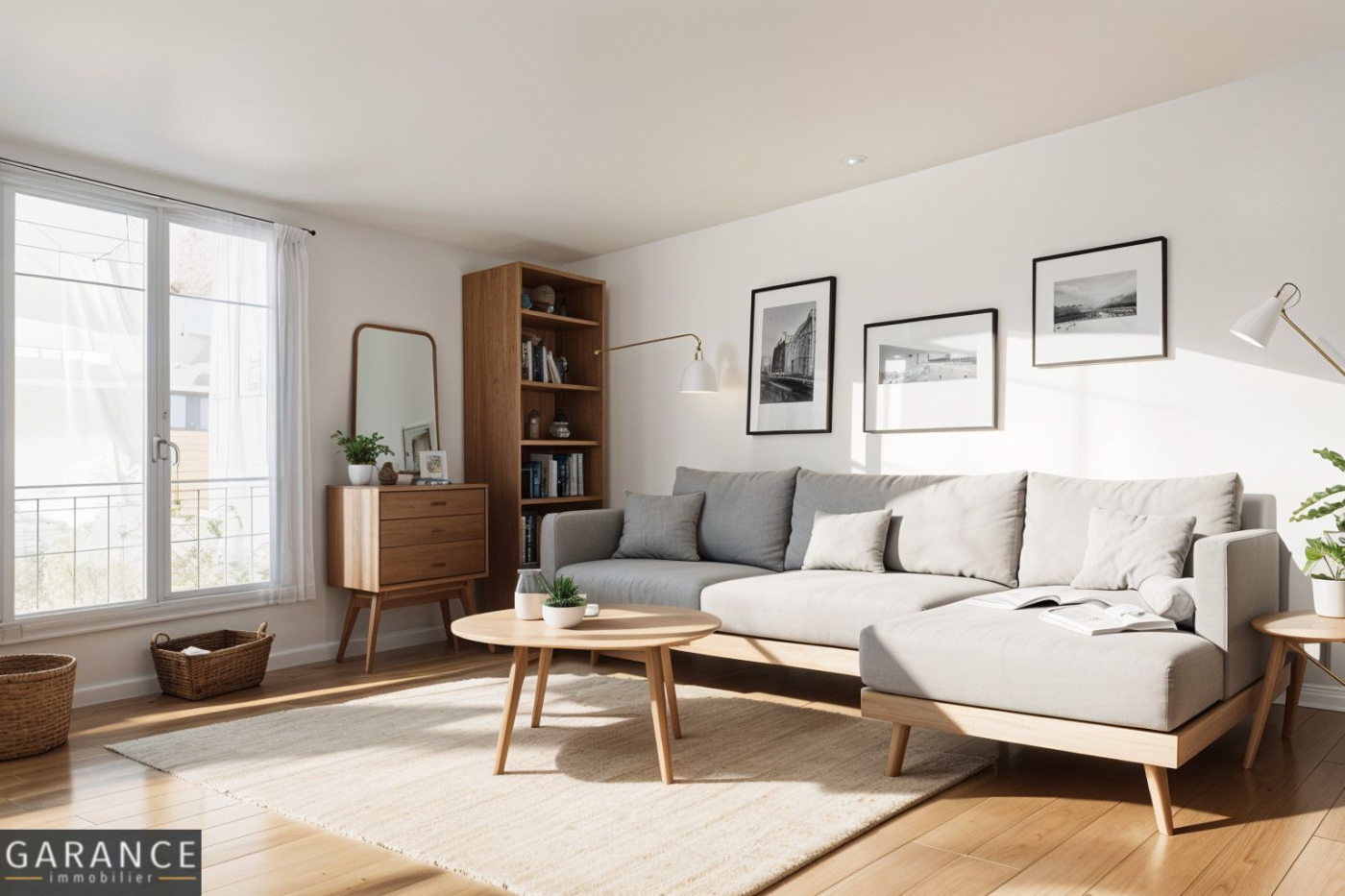 L'appartement se compose d'une entrée menant à un grand séjour doté de deux baies vitrées ouvrant sur une terrasse de 8 m² donnant sur une cour arborée. Cet espace de vie intègre une cuisine américaine aménagée et entièrement équipée, ainsi qu'un coin dinatoire et un espace bibliothèque/bureau. La chambre, orientée sur une seconde terrasse de 8 m² donnant sur une petite cour fermée, bénéficie d'un dressing intégré et d'une salle de bains semi-ouverte. Les WC sont indépendants.