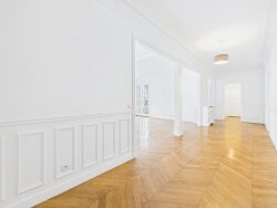 It comprises an entrance hall, a 47 sq m double living room, a separate kitchen with access to a staircase and service elevator, and a 25 sq m dining room. A hallway with built-in wardrobes leads to three bedrooms, a bathroom, and a shower room. There are two toilets. A laundry room with plumbing for washing machines and dryers completes the accommodation. Discover this charming apartment with its parquet flooring and moldings.