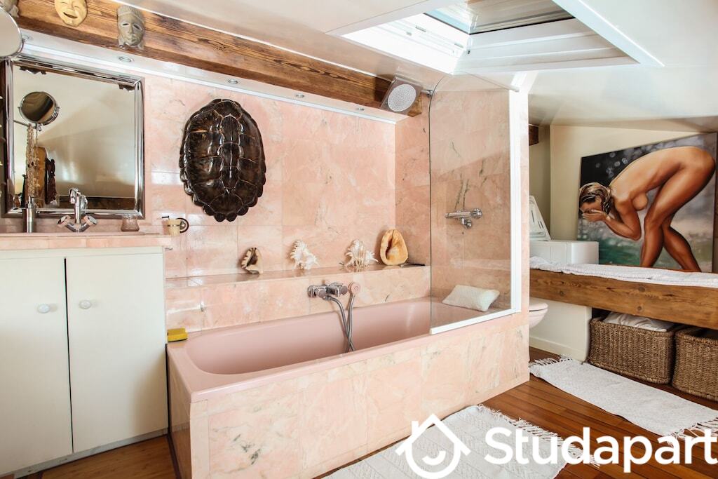Cet appartement en duplex est composé du séjour spacieux avec canapé et table à manger, de la cuisine entièrement équipée, de la chambre avec lit double, d'un bureau et de deux salles d'eau, dont une avec baignoire.