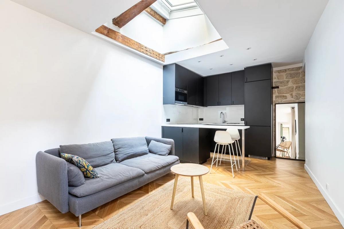 Paris 3ème - Le Marais. Situé dans un emplacement prisé au coeur du Marais, cet appartement de prestige se trouve dans un hôtel particulier du XVIIème siècle réhabilité, offrant un cadre de vie exceptionnel avec un système de haute sécurité comprenant un gardien et une vidéosurveillance 24h/24. Ce magnifique deux pièces s'ouvre sur une agréable terrasse et se compose d'un grand séjour avec coin repas, d'une cuisine ouverte entièrement équipée et aménagée, et d'un espace chambre délimité par une superbe verrière contemporaine. La salle d'eau est dotée d'une douche à l'italienne et d'un WC. L'appartement, en parfait état, allie confort moderne et charme de l'ancien avec son parquet et ses fenêtres à la française. Il bénéficie d'une décoration raffinée et de prestations de qualité, idéal pour un pied-à-terre. Une cave complète ce bien de luxe. Pour organiser une visite, contactez sans tarder Paris Vendôme Luxury - International Realty.
