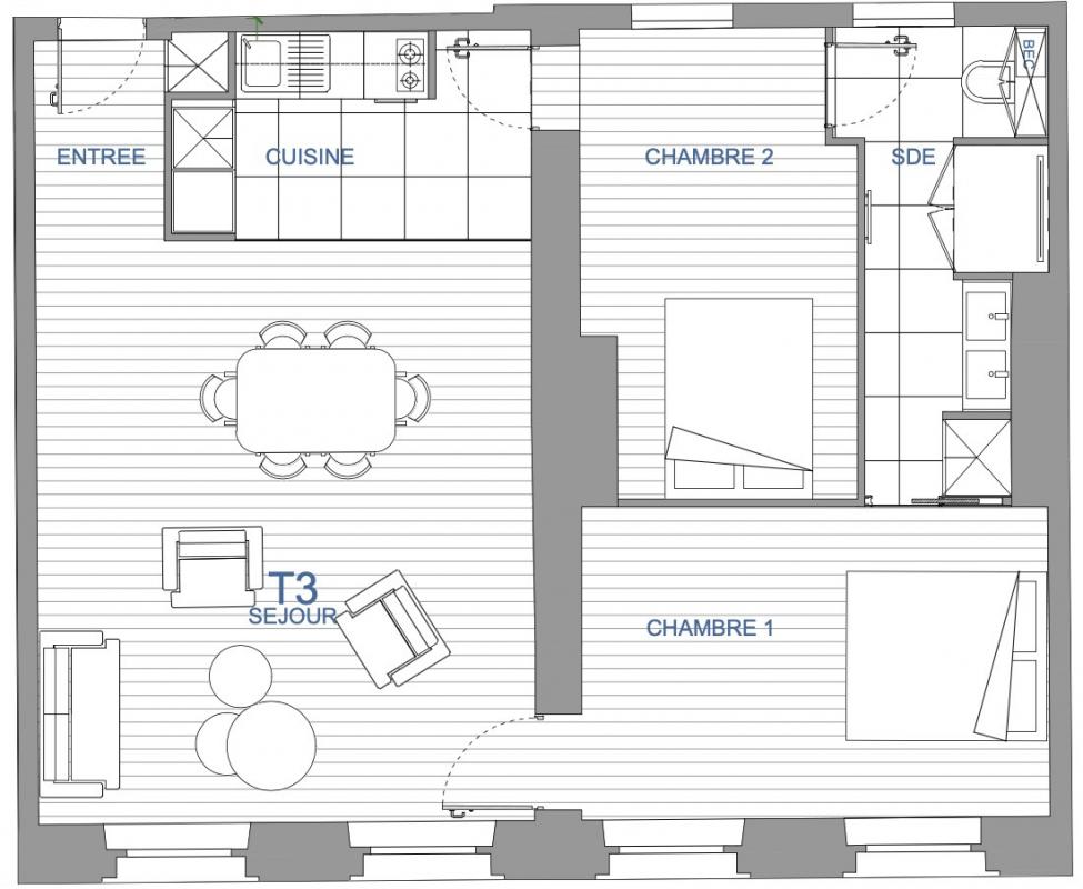 La partie nuit comprend deux chambres spacieuses, une salle de bain, un dressing et de nombreux rangements intégrés, apportant confort et praticité au quotidien.