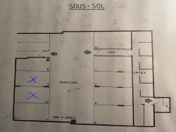 Deux places de parking côte à côte, numérotées 6 et 7. Dimensions : 2,30 x 5m et et 2,50 x 5m, soit 11,50m2 et 12,50m2. Hauteur : 2,38m (2m en-dessous de la poutre).