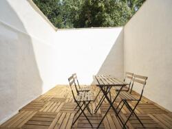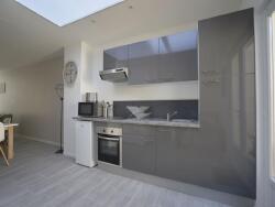 Une cuisine entièrement équipée ( frigo, micro onde, four, ustensiles de cuisines....) espace buanderie avec machine à laver et sèche linge ), donnant sur une belle cour , avec salon de jardin.WC au rez de chaussé.